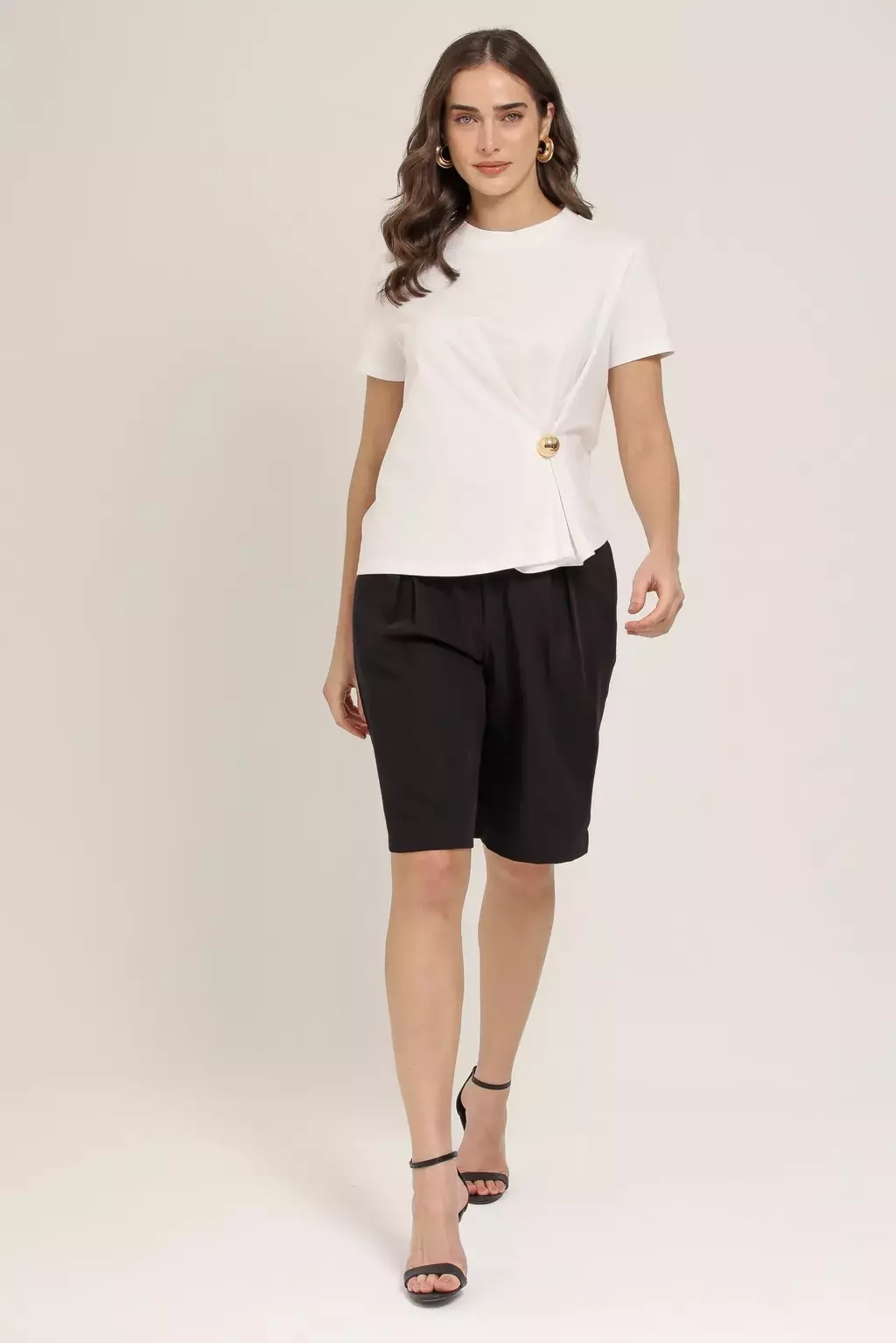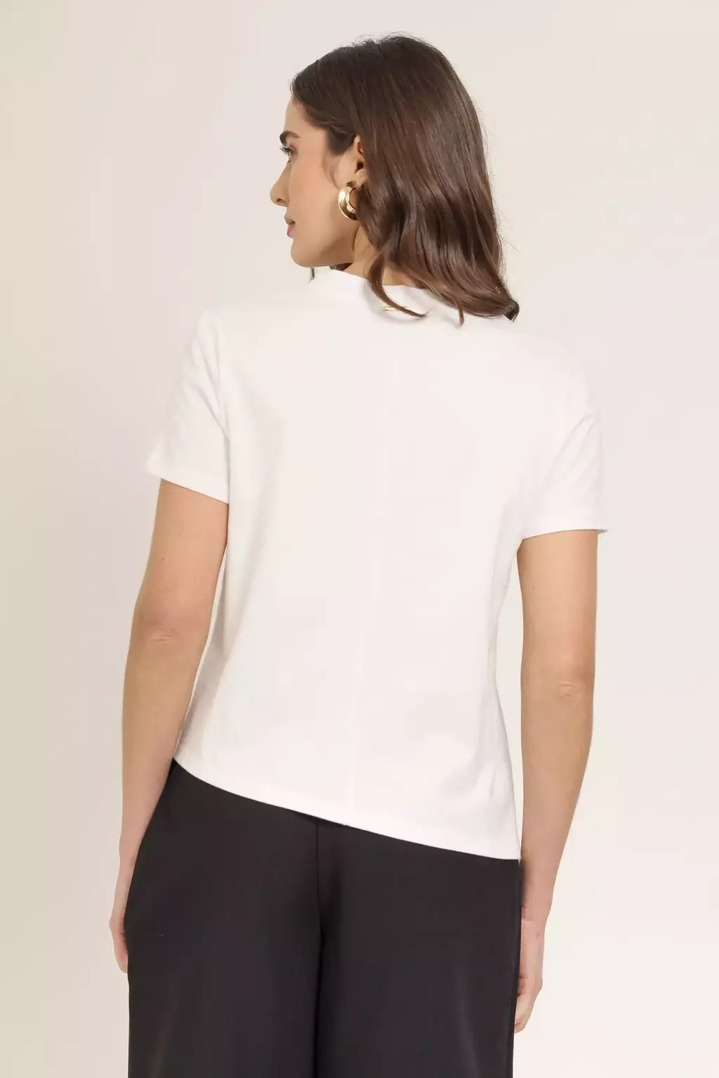 Blusa de malha. Decote redondo clássico. Manga curta. Detalhe de broche na cintura que valoriza a peça.