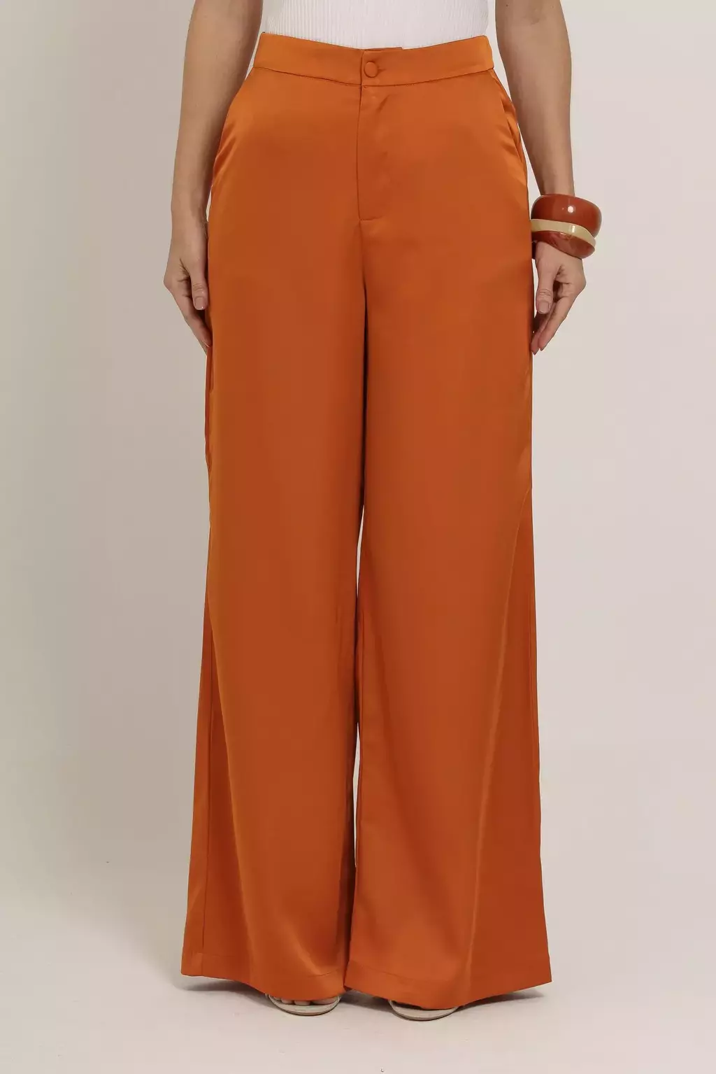 Calça acetinada de caimento leve. Cintura alta com fechamento por zíper e botão. Modelagem pantalona. Bolsos laterais funcionais. Estrutura fluida que alonga a silhueta com elegância.