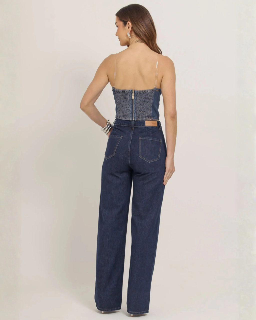 Calça jeans, comprimento longo com cintura alta. Fechamento frontal por zíper e botão metálico. Bolsos laterais e posteriores. Cós com passadores para cinto. Modelagem reta. Barra com acabamento pespontado convencional.