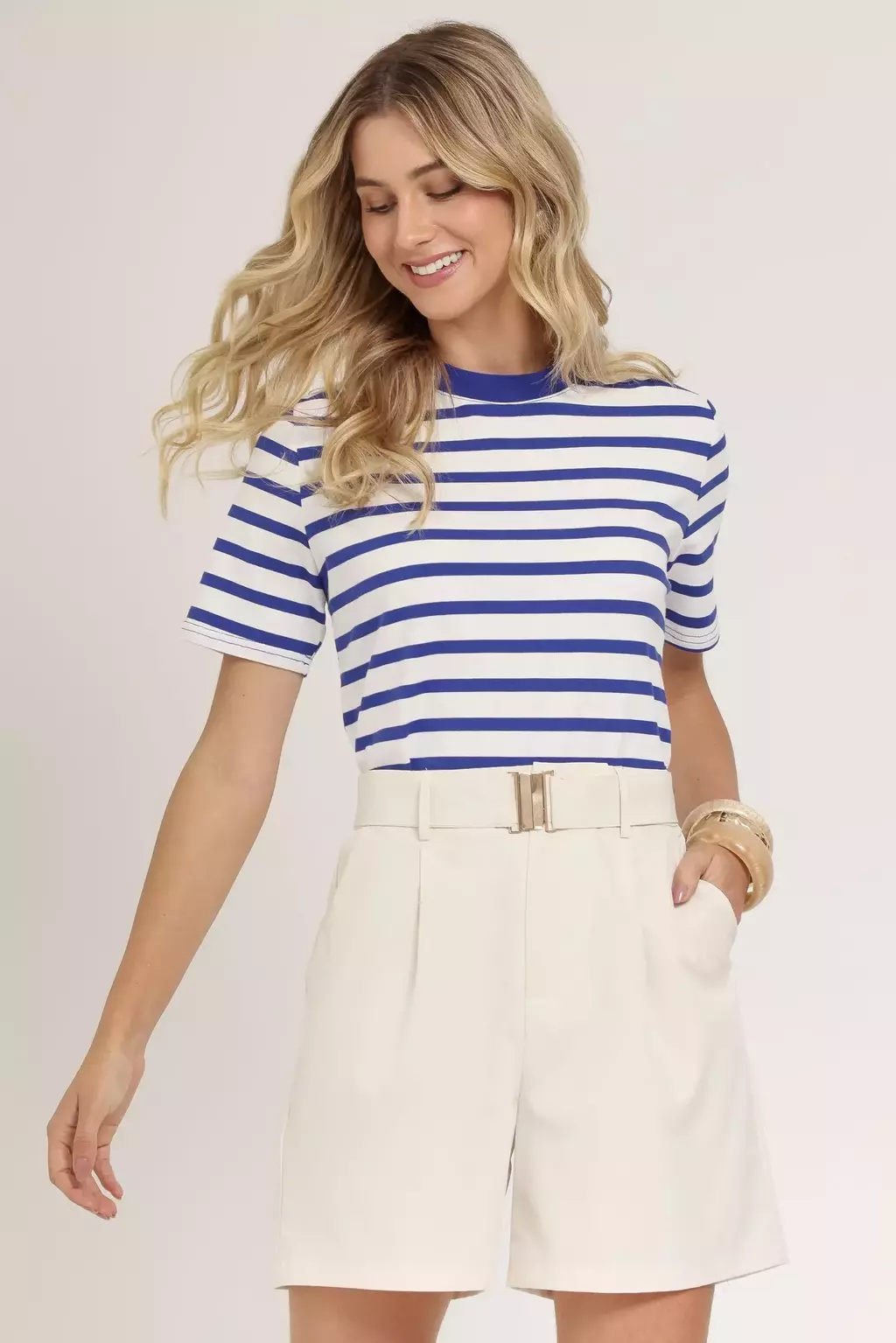 Shorts curto de alfaiataria em crepe com forro interno, pregas frontais que estruturam a peça, bolsos frontais funcionais. Faixa com fivela para amarração na cintura.